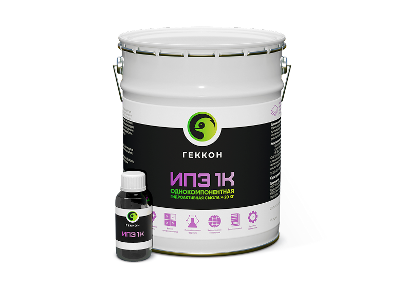 Геккон ИПЭ 1К - Однокомпонентная эластичная полиуретановая смола низкой вязкости и большого расширения с быстрым временем пенообразования при взаимодействии с водой и добавлении ускорителя реакции (в комплект поставки входит катализатор). После полимеризации образуется объемная, жестко-эластичная безусадочная пена с закрытыми порами, которая имеет высокую долговременную водонепроницаемость и адгезию. Находясь в полостях и трещинах, при отверждении образует пластоэластичную, не содержащую открытых пор, безусадочную мембрану. Полимеризовавшись, обладает способностью сдерживать напор воды и гасить деформации. Не содержит растворителей.